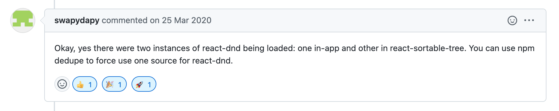 이슈를 계속 뒤적여보니, react-dnd가 내 package와 sortableTree 두 군데서 따로 load되어 사용되기 때문이라는 코멘트가 보였음
