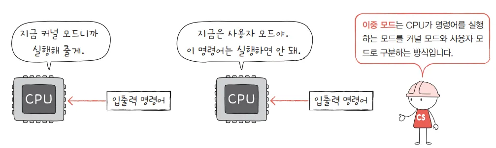 따라서 하드웨어 자원을 추상화하고 효율적인 운영에 책임이 있는 OS는, 프로세스의 하드웨어 자원 사용을 엄격하게 제한할 필요가 있습니다. 이를 위해 OS는 최소 두가지 실행 모드를 제공합니다.